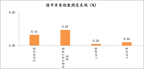 從圖3可知,上周債市指數(shù)整體表現(xiàn)較好,標(biāo)普中國可轉(zhuǎn)債指數(shù)漲幅居前,周跌幅為0.24%,中證綜合債、上證國債和上證企債周漲跌幅分別為0.16%、0.03%、0.05%。