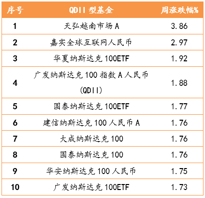 表1為上周各類型基金周度表現(xiàn)排名前十的基金列表。主動(dòng)偏股型基金周漲幅最高的是泰達(dá)宏利轉(zhuǎn)型機(jī)遇A,周漲幅7.51%;偏債型基金中收益回報(bào)位于榜首的是平安惠鴻純債,周漲幅2.92%;QDII型基金中表現(xiàn)最好的是天弘越南市場A,周漲幅3.86%。