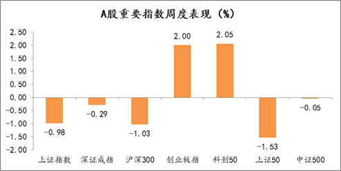 上周市場先抑后揚(yáng),主流指數(shù)漲跌不一,創(chuàng)業(yè)板指和科創(chuàng)50指數(shù)表現(xiàn)亮眼,分別上漲2.00%、2.05%。其余指數(shù)按照漲幅由高到低排序,依次為中證500、深證成指、上證指數(shù)、滬深300和上證50,周漲跌幅分別為-0.05%、-0.29%、-0.98%、-1.03%和-1.53%。