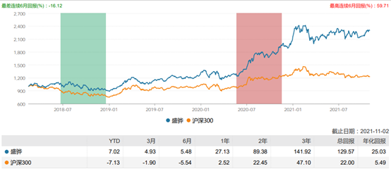 截至2021年11月2日,基金經(jīng)理盛豐衍的任職總回報(bào)為129.57%,年化回報(bào)為25.03%,同期滬深300總回報(bào)和年化回報(bào)分別為22%、5.49%,遠(yuǎn)遠(yuǎn)跑贏滬深300。