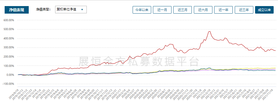 備注:表中的數(shù)據(jù)來源于展恒金方數(shù)據(jù)庫,統(tǒng)計(jì)日期截止于2021年12月1日,部分2021年11月26日。 連續(xù)回撤是指當(dāng)前凈值相較于歷史最大值的下跌幅度。