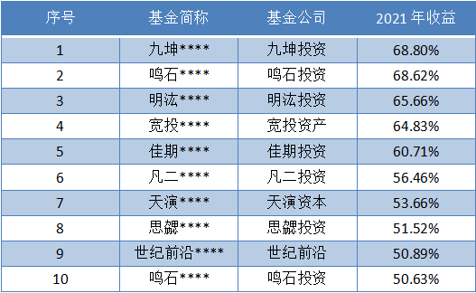 不同于股票主觀多頭較為集中的持股,量化選股策略的持股更為分散,所以,收益相比更低,風險更小。據(jù)統(tǒng)計,截止12月31日,股票量化選股策略業(yè)績排名前十的基金產(chǎn)品在2021年的收益率處于50%-100%,其中,九坤投資旗下的某只基金產(chǎn)品2021年收益率最高,達68.80%。2021年由于“股權(quán)糾紛”頻繁登上熱搜的鳴石投資的基金產(chǎn)品排名第二,收益率68.62%。不過,鳴石投資不止一只產(chǎn)品上榜,其另一只基金產(chǎn)品也出現(xiàn)在榜單,收益率達50.63%。鳴石投資可謂2021年的大贏家。明汯、寬投、佳期、嘉懇、凡二、天演、思勰、世紀前沿分別以64.83%、60.71%、56.46%、53.66%、51.52%、50.89%,位列其后。值得關(guān)注的是,思勰投資于2021年12月新晉百億私募。