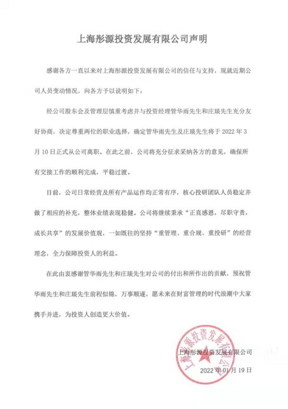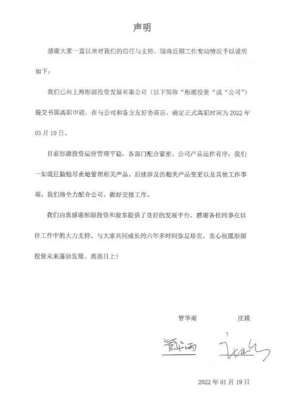 2022年1月19日,上海彤源投資發(fā)展有限公司與管華雨、莊琰同時(shí)發(fā)布聲明,兩人將于2022年3月10日正式從彤源投資離職,在此期間,兩人將確保所有交接工作順利完成,平穩(wěn)過渡,公司的相關(guān)核心人員已經(jīng)穩(wěn)定并且做了相應(yīng)的補(bǔ)充。