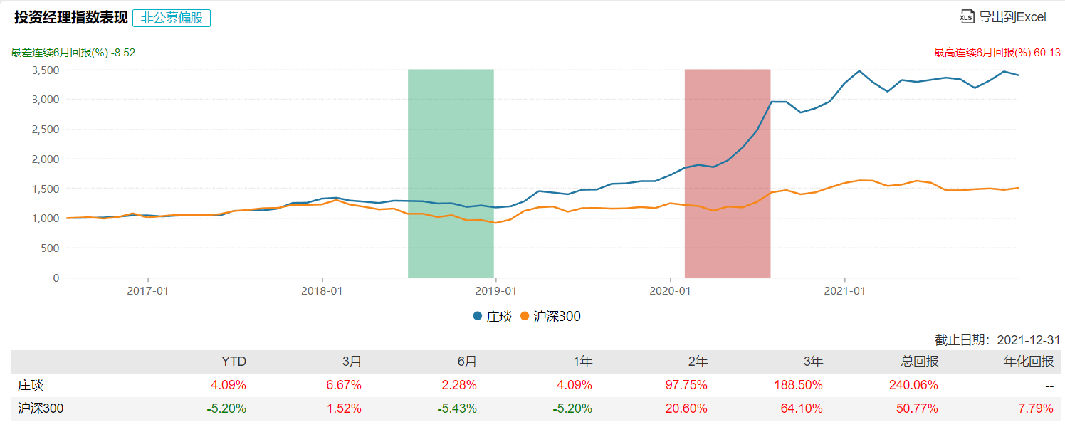 基金經(jīng)理莊琰與管華雨一樣出身于交銀施羅德,2015年兩人同時(shí)離開交銀施羅德并加入彤源投資,在彤源投資一直擔(dān)任高級(jí)研究員與基金經(jīng)理,曾管理2只基金,分別為中海信托-彤源6號(hào)和同慶1期。在職以來總回報(bào)達(dá)240.06%,大幅跑贏滬深300指數(shù)。