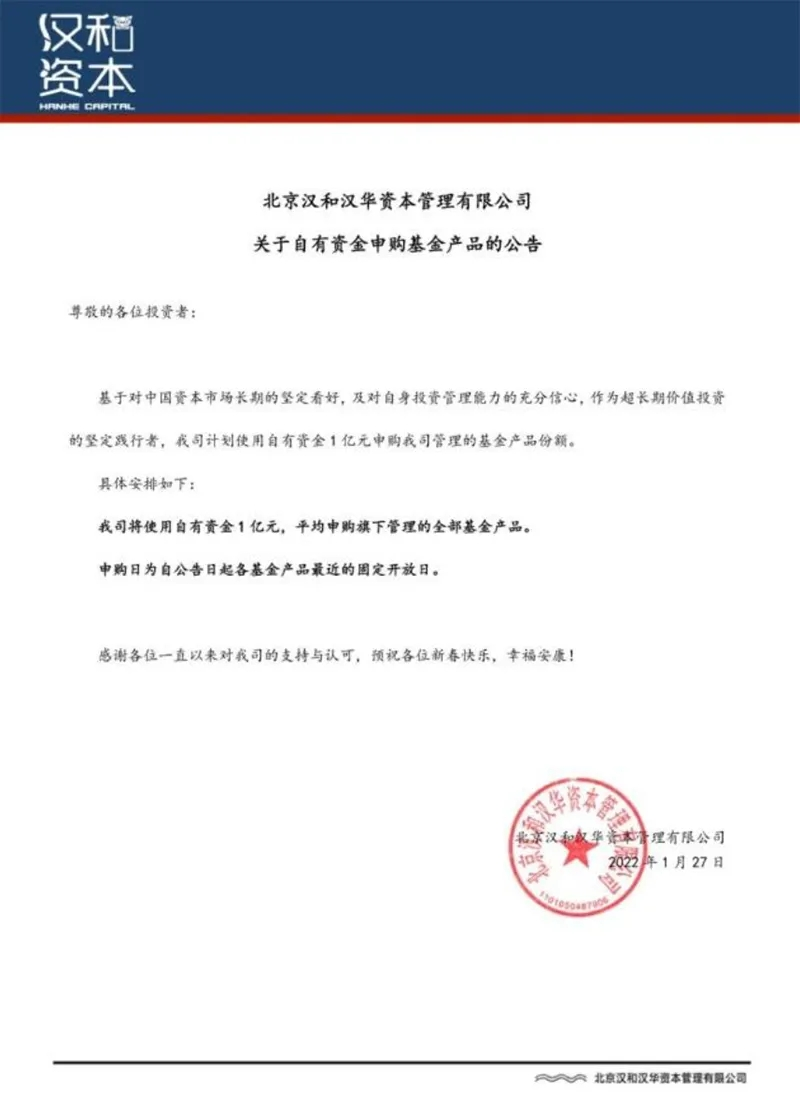 除新發(fā)基金作為增量資金跑步入場外,各基金公司也紛紛發(fā)起自購潮。據(jù)中國基金報統(tǒng)計,截至1月28日中午,短短兩天半時間(1月26日-28日),合計19家公募基金公告了相關(guān)信息,自購金額高達(dá)14億元。除此之外,私募也以實際行動響應(yīng)自購潮流。今日,北京漢和漢華資本在公司公眾號上發(fā)布了《北京漢和漢華資本管理有限公司關(guān)于自有資金申購基金產(chǎn)品的公告》。公告表示,基于對中國資本市場長期的堅定看好,及對自身投資管理能力的充分信心,作為超長期價值投資的堅定踐行者,我司計劃使用自有資金1億元申購我司管理的基金產(chǎn)品份額。該司的申購計劃也將于公告日起各基金產(chǎn)品最近的固定開放日執(zhí)行。無獨有偶,知名百億私募永安國富也于今日宣布增加1億元自有資金至公司基金產(chǎn)品,其中6000萬元于今日完成,剩余4000萬元將于后續(xù)開放日完成。我們相信這兩家只是開端,后續(xù)會有更多的私募機構(gòu)加入到本次的自購潮中。