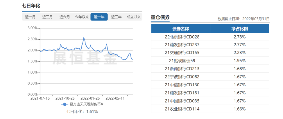 圖1 易方達天天理財貨幣A近一年七日年化(左)與重倉債券(右)