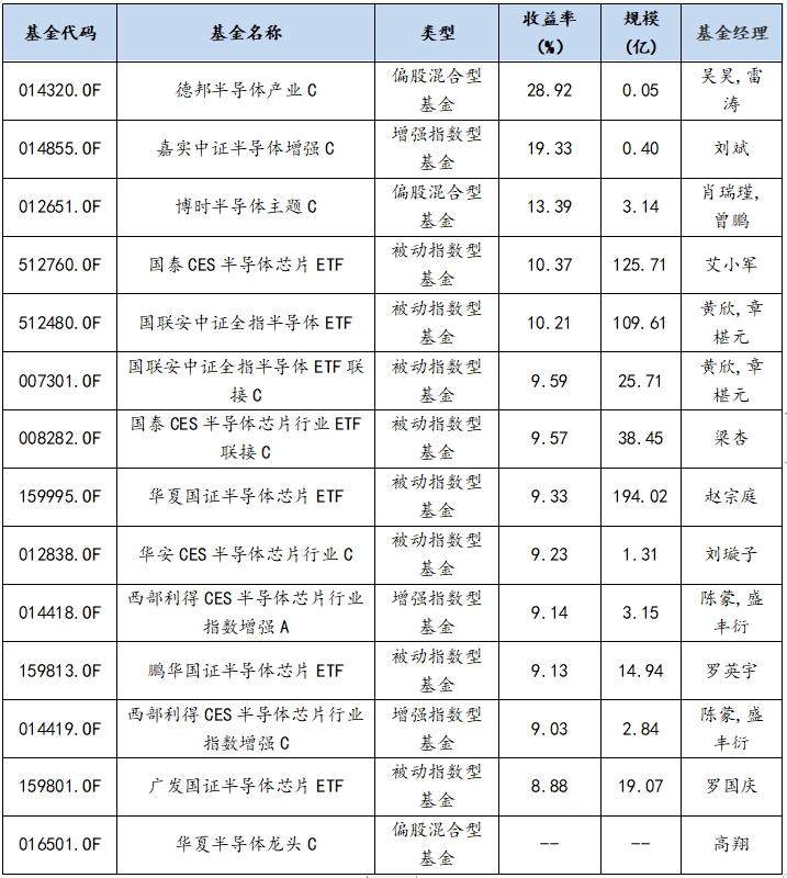 近3個月,隨著市場的反彈,半導體板塊走勢也逐漸走強,并領(lǐng)跑市場。據(jù)Wind數(shù)據(jù)庫統(tǒng)計,截止2022年8月19日,近一季漲幅約6.83%。我們也統(tǒng)計了部分半導體主題基金近3個月的走勢,如表1??梢钥闯?,半導體主題基金在近3個月均取得正收益,其中,收益率最高的基金-德邦半導體產(chǎn)業(yè)C近3個月反彈近28.92%,而其他基金反彈幅度雖然有所降低,但大多數(shù)漲幅都在9%附近。