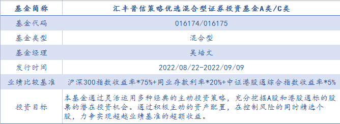 匯豐晉信策略優(yōu)選混合A/C(016174/016175)是一只偏股混合型基金,本基金對(duì)股票投資比例范圍為基金資產(chǎn)的60%-95%(其中投資于港股通標(biāo)的股票的比例占股票資產(chǎn)的0-50%);市場上存在若干種經(jīng)典的主動(dòng)投資策略,但單一的策略面對(duì)不同的市場環(huán)境可能面臨階段性失效,本基金通過靈活運(yùn)用多種經(jīng)典的主動(dòng)投資策略,力求增強(qiáng)投資組合表現(xiàn)的穩(wěn)定性,股債靈活搭配,覆蓋A+H,投資回報(bào)具有較明顯的優(yōu)勢,是投資者進(jìn)行投資的優(yōu)質(zhì)工具。該只基金募集期為2022年8月22日至2022年9月9日,擬任基金經(jīng)理為吳培文。