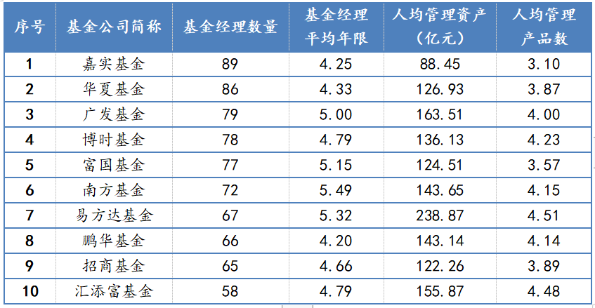 表:基金經(jīng)理數(shù)量排名前十的基金公司