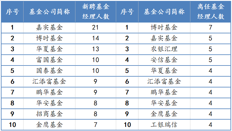 表:年內(nèi)新聘、離任基金經(jīng)理人數(shù)排名前十的基金公司