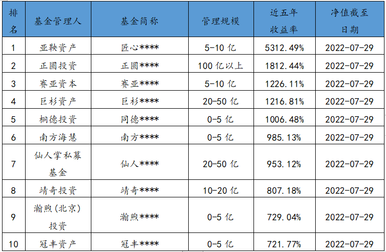 據(jù)展恒基金研究中心統(tǒng)計發(fā)現(xiàn),截止2022年7月29日,近五年收益率排名前十的股票策略私募公司分別為亞鞅資產(chǎn)、正圓投資、賽亞資本、巨杉資產(chǎn)、桐德投資、南方?;?、仙人掌私募基金、靖奇投資、瀚煦(北京)投資、冠豐資產(chǎn)。其中,收益率最高的亞鞅資產(chǎn)近五年實現(xiàn)5312.49%的累計收益率,年化收益率約119.28%,也就是說近五年幾乎每年都可實現(xiàn)收益翻倍。而且該公司的收益率也遠高于排名第二的正圓投資1814.44的收益率。其余入選的私募雖然收益率遠不及亞鞅,但也實現(xiàn)了不菲的收益率,最高的為1812.44%,最低的為721.77%,對應的年化收益率為93.09%、31.19%。之所以會取得如此高的收益率,應該與入選公司較小的規(guī)模、較高的持倉和高超的選股能力相關(guān)。據(jù)統(tǒng)計,大多數(shù)入選私募公司的管理規(guī)模處于0-10億,規(guī)模偏小。僅1家私募規(guī)模處于10-20億,2家私募處于20-50億,百億私募也僅一家入選,為正圓投資。