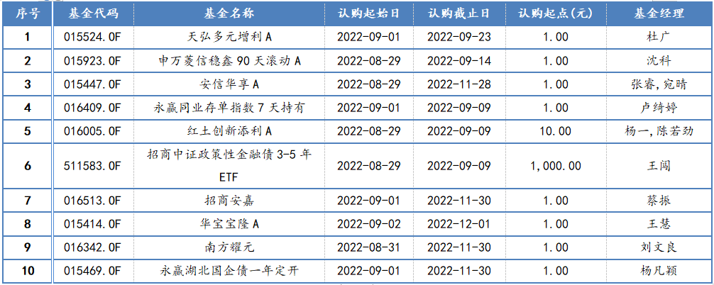 Wind數(shù)據(jù)顯示,本周(8月29日-9月2日)共有22只新基金(A、C份額合并計(jì)算)將陸續(xù)發(fā)行,涉及天弘基金、南方基金、華夏基金、招商基金、諾安基金等多家基金公司。從基金類型來(lái)看,本周新發(fā)的產(chǎn)品中權(quán)益類基金擔(dān)當(dāng)發(fā)行主力軍,共有2只被動(dòng)指數(shù)型基金及9只偏股混合型基金在本周開啟認(rèn)購(gòu)。此外,還有5只純債基金、3只混合二級(jí)債基、2只被動(dòng)指數(shù)型債券基金以及1只QDII混合型基金也將在本周面市。