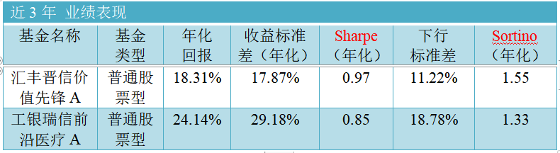 通過比較兩個比值計算公式就能夠明白二者都是衡量單位風險中獲得收益的大小,只是衡量風險指標不同,一般我們都希望風險相同下,收益越高越好,收益相同下,風險越低越好。簡單來說,就是這兩個指標越大越好。如下圖所示,匯豐晉信價值先鋒A的近3年夏普(Sharpe)比率高于工銀瑞信前沿醫(yī)療A的夏普比率,索提諾(Sortino)比率也高于工銀瑞信前沿醫(yī)療A,從這兩個指數(shù)來說,匯豐晉信價值先鋒A比工銀瑞信前沿醫(yī)療A表現(xiàn)的更為穩(wěn)健。