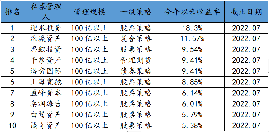 進(jìn)一步地,本文也梳理了今年年初到七月底收益率排名前十的百億私募(按照公司綜合收益率排名),這些機(jī)構(gòu)分別為迎水投資、汣瀛資產(chǎn)、思勰投資、千象資產(chǎn)、洛肯國(guó)際、上海寬德、盈峰資本、泰潤(rùn)海吉、白鷺資產(chǎn)、誠(chéng)奇資產(chǎn)。據(jù)統(tǒng)計(jì),上榜機(jī)構(gòu)的年內(nèi)收益率介于5%-19%,其中排名第一的迎水投資今年以來收益率為18.3%,排名第二的汣瀛11.57%,排名第10的誠(chéng)奇資產(chǎn)5.38%。因此,可看出迎水投資遠(yuǎn)超其他機(jī)構(gòu)。從策略分布上看,10家中有7家是股票策略,其余三家分別是管理期貨策略、債券策略和復(fù)合策略,與今年以來獲取正收益率的機(jī)構(gòu)策略分布相似。