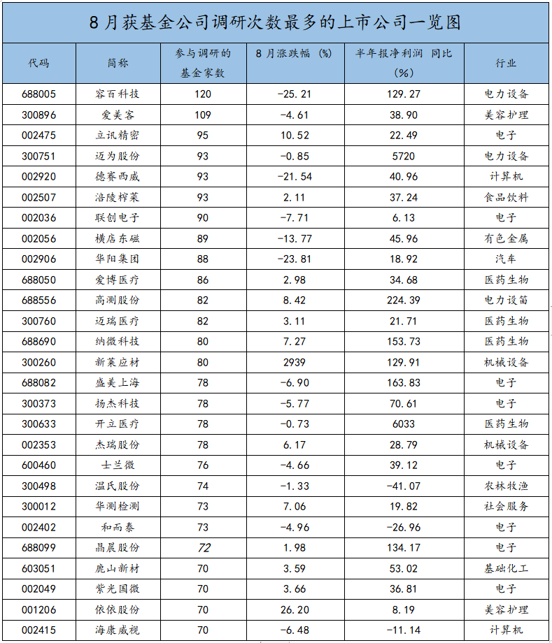 據(jù)統(tǒng)計,8月共計27家公司獲得70家及以上基金公司調(diào)研。而且,這27家獲密集調(diào)研的上市企業(yè)中,絕大多數(shù)半年報業(yè)績較為出色,公司凈利潤實(shí)現(xiàn)正增長。如高測股份、盛美上海、納微科技、晶晨股份、新萊應(yīng)材、容百科技上半年凈利潤更是同比增長100%以上。這也是這些機(jī)構(gòu)受基金公司親睞的原因之一。