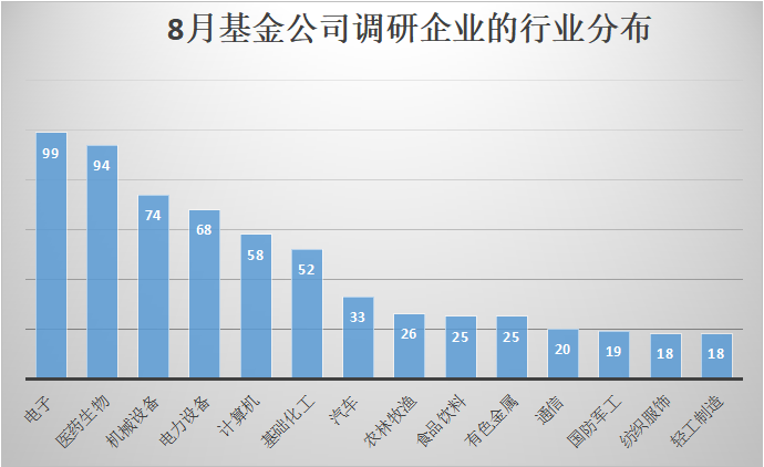 據(jù)Wind數(shù)據(jù)庫統(tǒng)計,基金公司合計調(diào)研748家上市公司,較7月環(huán)比增加168家。通過表1,我們可以發(fā)現(xiàn),從行業(yè)角度來看,8月基金公司調(diào)研企業(yè)主要分布在14個行業(yè)。其中,電子、醫(yī)藥生物板塊受調(diào)研的上市企業(yè)數(shù)量最多,分別為99家和94家;其次是機(jī)械設(shè)備、電力設(shè)備、計算機(jī)和基礎(chǔ)化工板塊,這些板塊受調(diào)研的上市企業(yè)數(shù)量也都在50家以上;剩下板塊受調(diào)研的上市企業(yè)數(shù)量較少,具體如下圖所示。