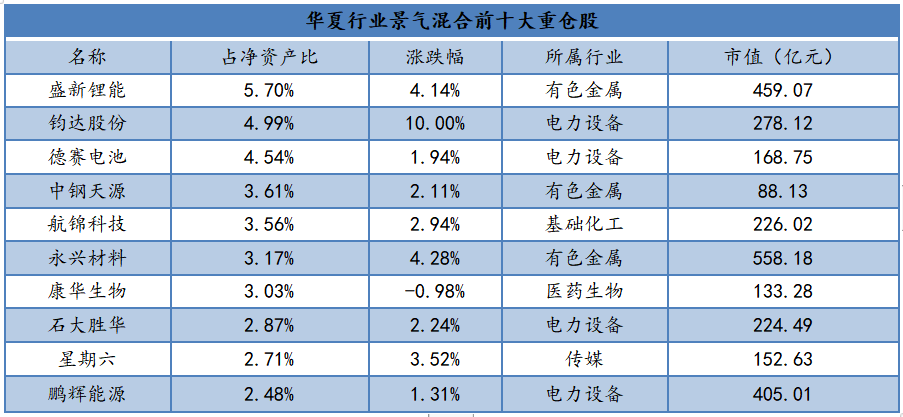 華夏行業(yè)景氣混合前十大重倉股分別為盛新鋰能、鈞達(dá)股份、德賽電池、中鋼天源、航錦科技、永興材料、康華生物、石大勝華、星期六、鵬輝能源,如下圖所示。其中,除康華生物之外都實(shí)現(xiàn)了正向增長,其中盛新鋰能、德賽電池、鵬輝能源從事鋰離子電池的研發(fā)、生產(chǎn)和銷售,鈞達(dá)股份從事光伏設(shè)備及元器件制造、石大勝華、永興材料從事新材料技術(shù)研發(fā),像光伏、新材料、鋰電池都屬于今年的高景氣行業(yè),但從市值上可以發(fā)現(xiàn)這些公司都偏小。