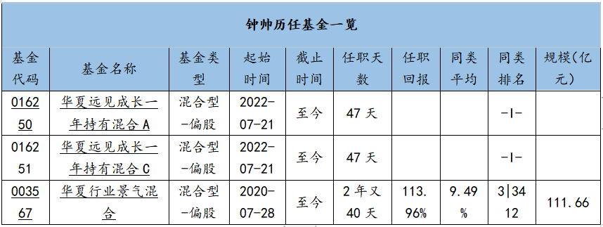 基金經(jīng)理鐘帥目前在管的基金共有3只,分別為華夏行業(yè)景氣混合、華夏遠(yuǎn)見成長一年持有混合A、華夏遠(yuǎn)見成長一年持有混合C。3支均為混合偏股型基金,由于華夏遠(yuǎn)見成長一年持有混合A、華夏遠(yuǎn)見成長一年持有混合C還在認(rèn)購期未統(tǒng)計(jì)基金規(guī)模,鐘帥目前在管規(guī)模111.66億。