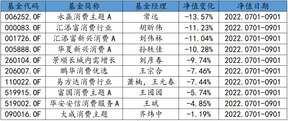 近一段時間,消費板塊結(jié)束6月的上漲趨勢,7月初開始震蕩回調(diào),至9月6日中證消費(000932)跌幅超10%。從相關(guān)板塊的基金業(yè)績看,也都出現(xiàn)了明顯下行。從7月1日至9月1日,在選取的10只具有代表性的消費主題基金中,永贏消費主題A、匯添富消費行業(yè)、匯添富新興消費A、華夏新興消費A4只基金凈值跌幅均超10%,其余6只基金也有不同程度的下跌。