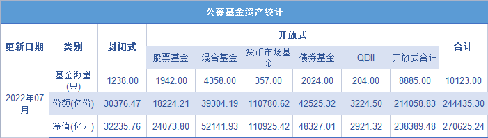 截至2022年7月底,我國(guó)共有140家基金管理公司。其中,外資基金管理公司45家,內(nèi)資基金管理公司95家;獲得公募基金管理資格的證券公司或證券公司資產(chǎn)管理子公司12家,保險(xiǎn)資產(chǎn)管理公司2家。上述機(jī)構(gòu)管理的公募基金共管理產(chǎn)品為10123只,資產(chǎn)凈值合計(jì)27.06萬(wàn)億元。