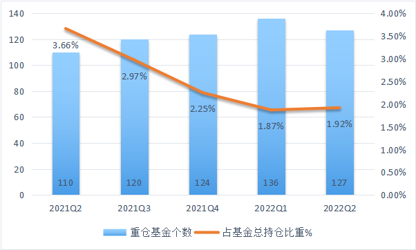 基金方面,市場(chǎng)也開(kāi)始紛紛重新布局計(jì)算機(jī)板塊。根據(jù)上半年的公募基金持倉(cāng)情況,通過(guò)下圖公募基金計(jì)算機(jī)板塊重倉(cāng)情況分析,整體來(lái)看近一年機(jī)構(gòu)重倉(cāng)計(jì)算機(jī)板塊標(biāo)的增多,主要受益于相關(guān)上市公司增多。而2022年Q2公募基金前十大重倉(cāng)中,重倉(cāng)計(jì)算機(jī)公司數(shù)量較一季度有了小幅下降,從136下降到127。而計(jì)算機(jī)板塊重倉(cāng)股倉(cāng)位相較上季度卻出現(xiàn)了觸底回升,因此持倉(cāng)集中度變得較為集中。