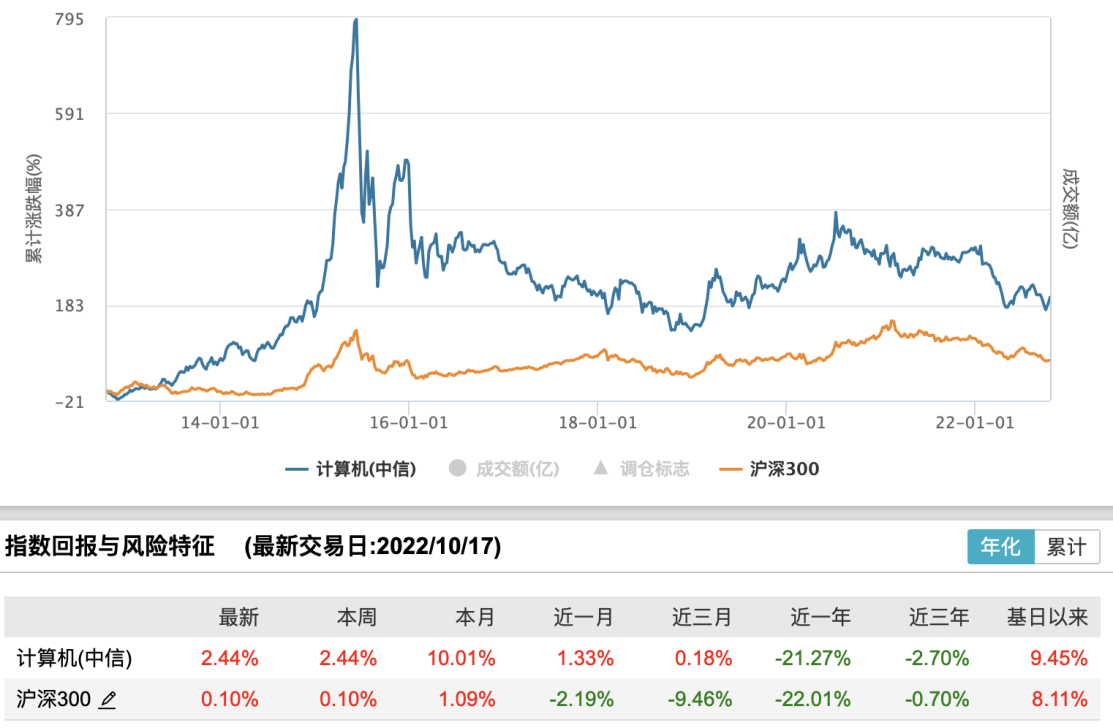 10月17日,市場(chǎng)針對(duì)報(bào)告做出反應(yīng),中信計(jì)算機(jī)指數(shù)收漲2.44%,跑贏滬深300指數(shù)2.34%。本月以來(lái)累計(jì)漲幅10.01%。