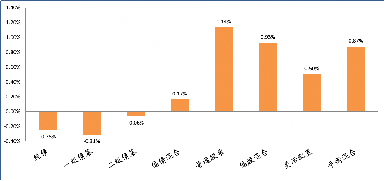 權(quán)益方面,普通股票型基金、偏股混合型基金、靈活配置型基金、平衡混合型基金的平均收益率分別為1.14%、0.93%、0.50%、0.87%。