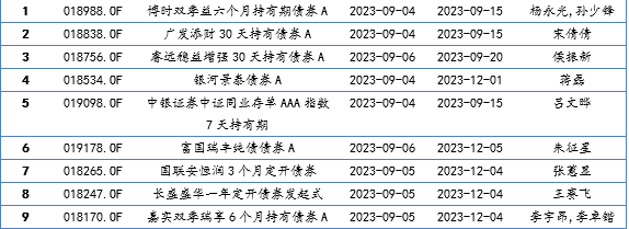 備注:博時雙季益六個月持有期債券A、廣發(fā)添財30天持有債券A、睿遠穩(wěn)益增強30天持有債券A、銀河景泰債券A、中銀證券中證同業(yè)存單AAA指數(shù)7天持有期、富國瑞豐純債債券A、國聯(lián)安恒潤3個月定開債券、長盛盛華一年定開債券發(fā)起式、嘉實雙季瑞享6個月持有債券A
