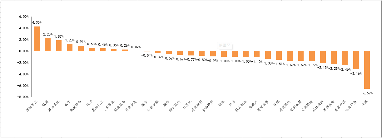 從行業(yè)板塊來(lái)看(圖2),上周31個(gè)申萬(wàn)一級(jí)行業(yè)板塊表現(xiàn)一般,10個(gè)板塊上漲,其余21個(gè)板塊下跌。具體來(lái)看,漲跌幅排名前五的行業(yè)依次為:國(guó)防軍工、煤炭、石油石化、電子、機(jī)械設(shè)備,周漲跌幅分別為4.30%、2.25%、1.87%、1.23%、0.91%;漲跌幅排名末五的行業(yè)依次為:傳媒、電力設(shè)備、美容護(hù)理、醫(yī)藥生物、農(nóng)林牧漁,周漲跌幅分別為-6.59%、-3.16%、-2.46%、-2.29%和-2.15%。