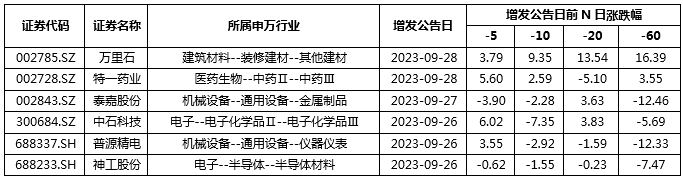 圖4:本周發(fā)布增發(fā)公告的A股上市公司不同時期漲跌統(tǒng)計