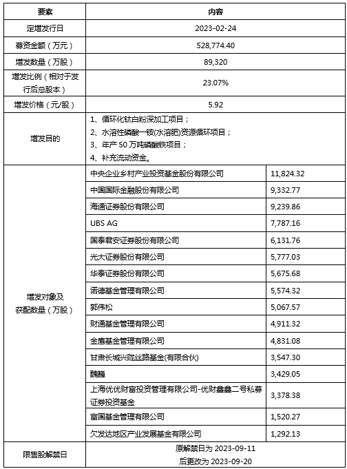 中核鈦白主營業(yè)務(wù)是金紅石型鈦白粉的研發(fā)、生產(chǎn)和銷售,2007年于深交所中小板掛牌上市。2023年2月,中核鈦白通過定向增發(fā)募集資金52.88億元,詳細信息如下表所示: