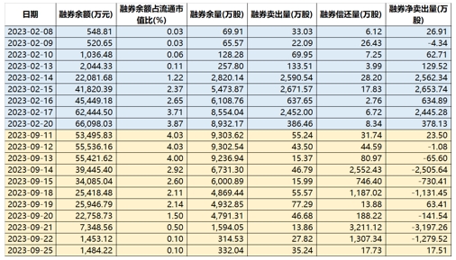 表8:2023年2月15日和2023年9月20日前后中核鈦白融券余額及相關(guān)數(shù)據(jù)