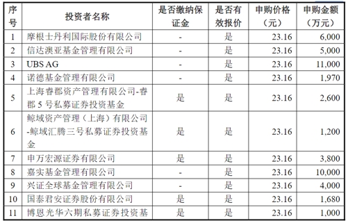 璞泰來在此次定增發(fā)行報告書中披露了定增申購報價情況,此次定增經(jīng)歷了兩輪申購。首輪共有5家機構申購,申購金額為22.45億元(如下表所示)。