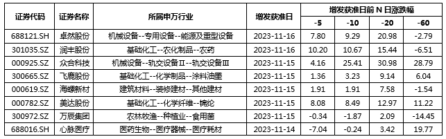 (1) 距現(xiàn)在20~40個交易日內(nèi)增發(fā)獲準、增發(fā)規(guī)模/總市值>10%的股票: