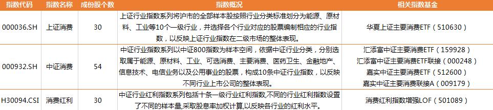 主要消費是我們?nèi)粘I钪械南M必需品,比如吃的、喝的、生活用品等,相關指數(shù)有三只,分別是上證消費、中證主要消費、中證主要消費紅利,指數(shù)詳細信息如下:
