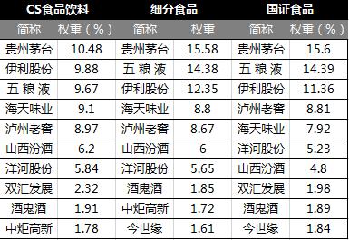 此外,細分食品和國證食品中酒占比較高,比分別是64%、63%%,食品占比大約是35%。而CS食品飲料指數(shù)中酒和食品占比55:44。