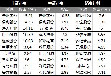 從持倉來看,上證消費和中證消費含酒量較高,第一大權重股都是貴州茅臺。