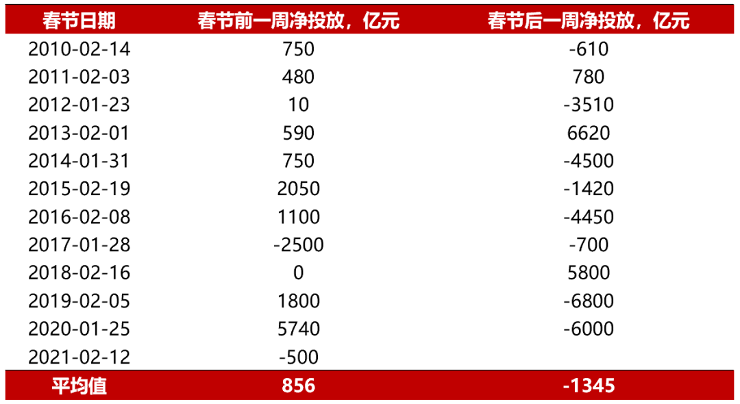 據(jù)浙商證券統(tǒng)計,回顧過去2010年以來央行在春節(jié)前后公開市場操作的情況,可以發(fā)現(xiàn),通常年前會釋放流動性(平均凈投放856億元),而在年后往往將流動性收回(平均凈回籠1345億元)。